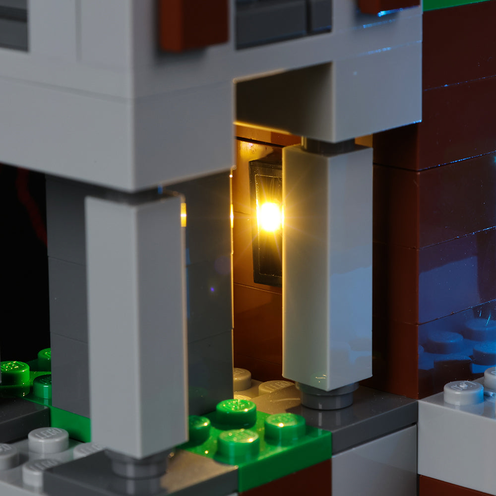 Crafted into the side of a mountain, the diamond sword base is the heart of this set. Now, with the added magic of LEGO lights, every detail of the base, from the chill-out zone to the shooters at the front, gets highlighted, making it a radiant beacon against any approaching hostile mobs. The interiors, including the table, cookie, and jukebox, glow invitingly, promising safety and fun amidst the challenges outside.