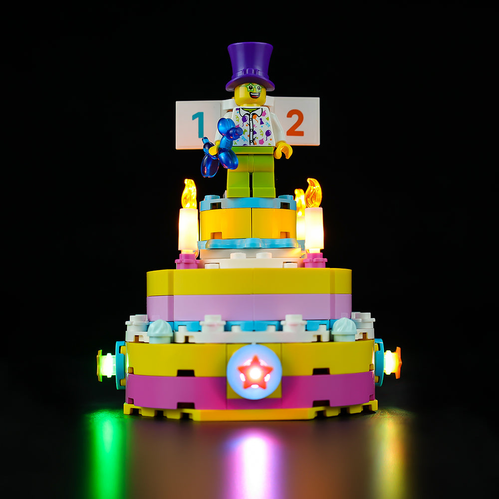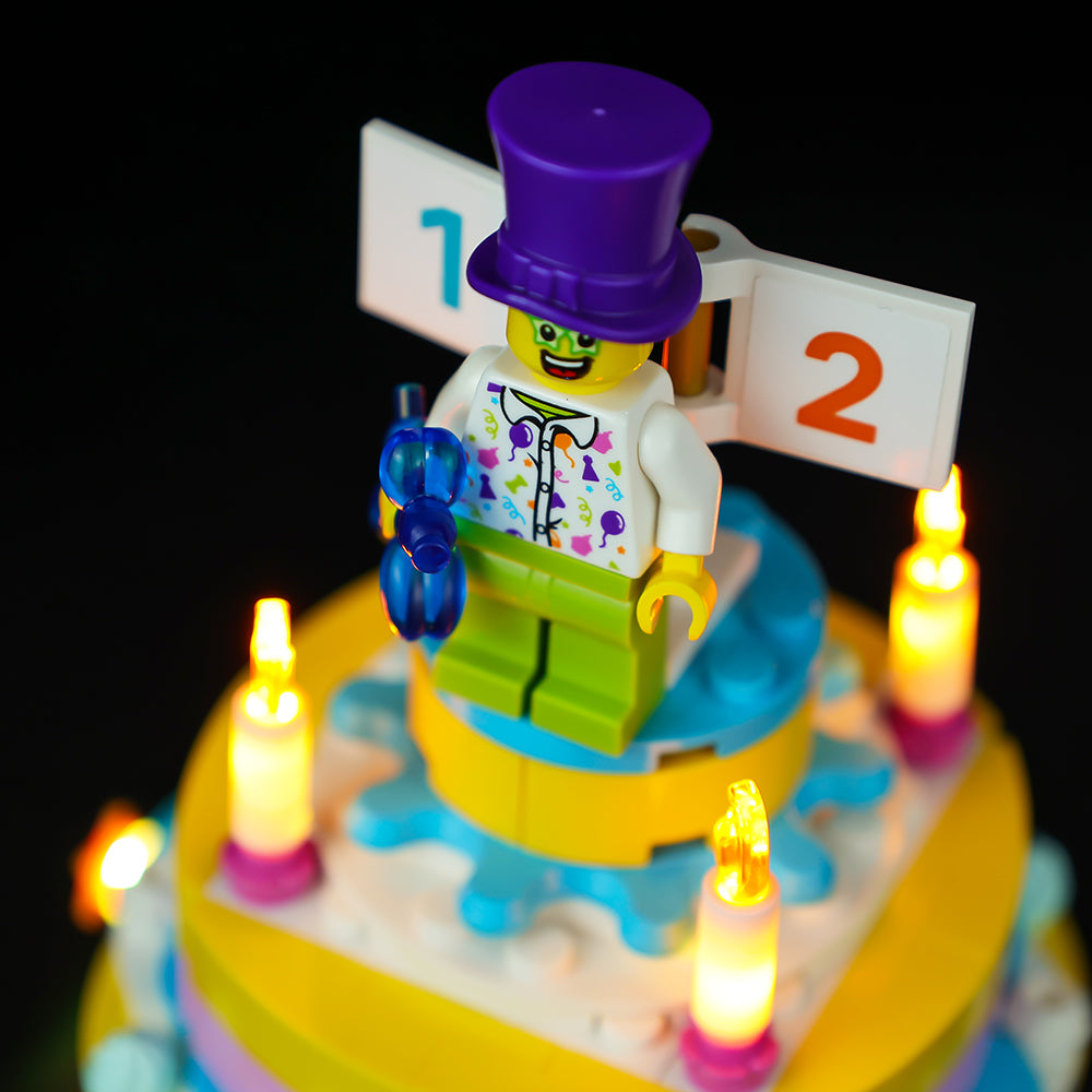 A brick-built cake with a top tier you can spin around, as well as embellishments like buildable candles and a balloon animal element, are included in this 141-piece colorful construction LEGO Birthday Set 40382 toy. A top-hatted minifig stands on top of the cake, carrying flags from a sticker sheet with the birthday boy or girl's age on them. It's a wonderful way to commemorate a significant day, and it's great for solo or group construction! Celebrate your friend's birthday by gifting him the LEGO Birthday Set 40382. Make this toy cake look eye-catching by customizing it with our LEGO LED Lights.