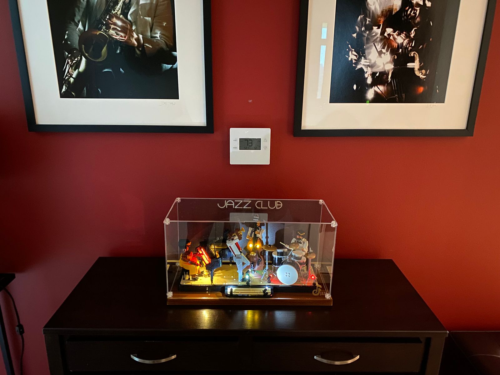 I then decided to enclose the entire package in an acrylic display case which sits on a small table in our main entry way just inside the front door. We live in Three Light apartments in downtown KC which has a jazz them. This allowed us to really add to our design theme to fit the building theme and provides a great conversation piece when folks walk in our front door.. See the pictures attached. If you like to work with your hands and build things, and enjoy showing off the results, you can’t miss with this setup. I highly recommend Game of Bricks light sets. I also have their set for the Lego Bouquet of Roses set which I put together for my wife this past…