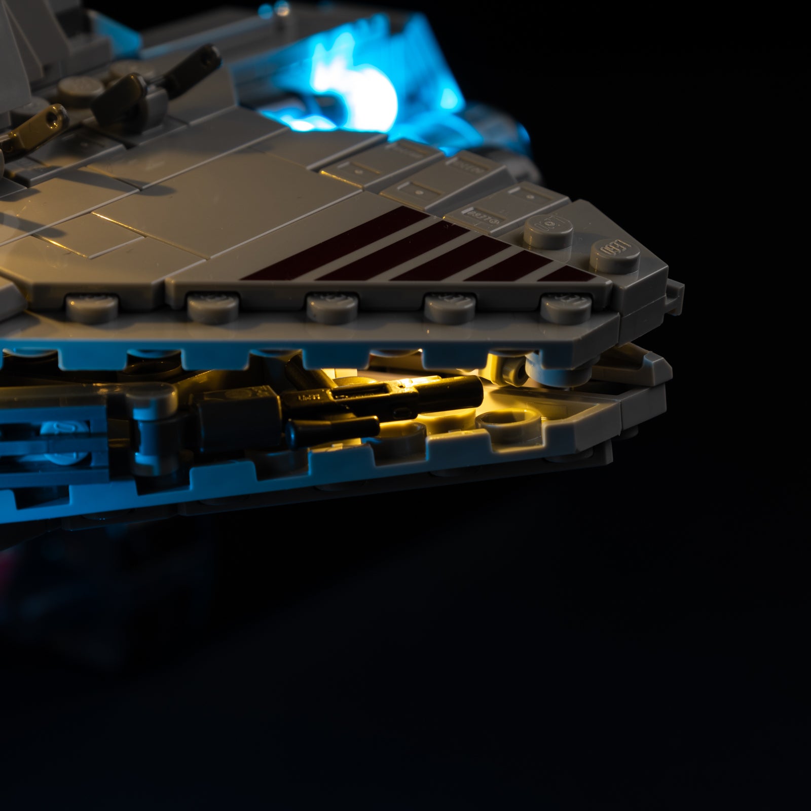 Accent the streamlined silhouette, iconic red markings, and bridge structure with precision-placed LEDs. The entire cruiser glows with galactic energy, emphasizing its powerful stance and clean lines.