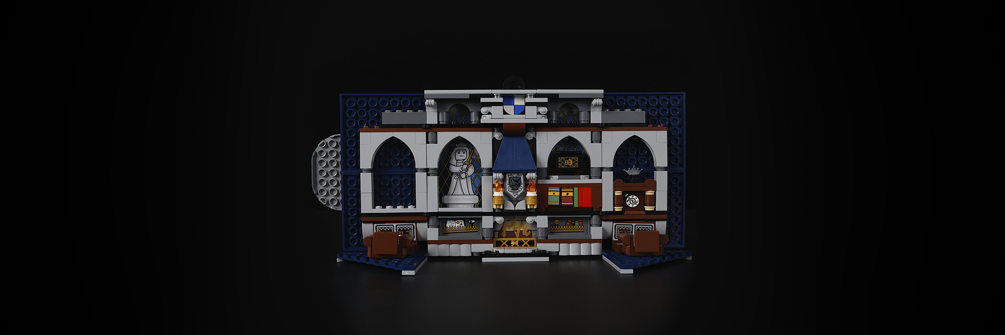 The banner features the authentic Ravenclaw crest and opens to reveal a common room with a buildable table, book, seats, lamps, and Ravenclaw's Diadem, bringing the world of Harry Potter to life.