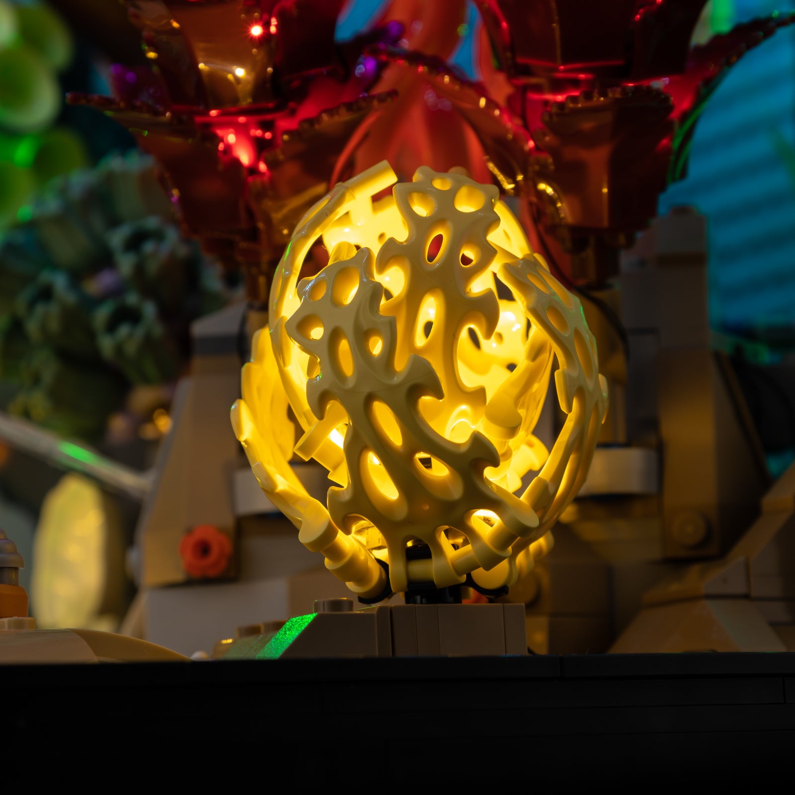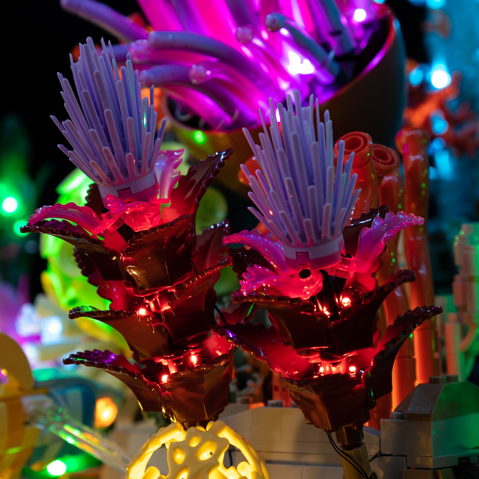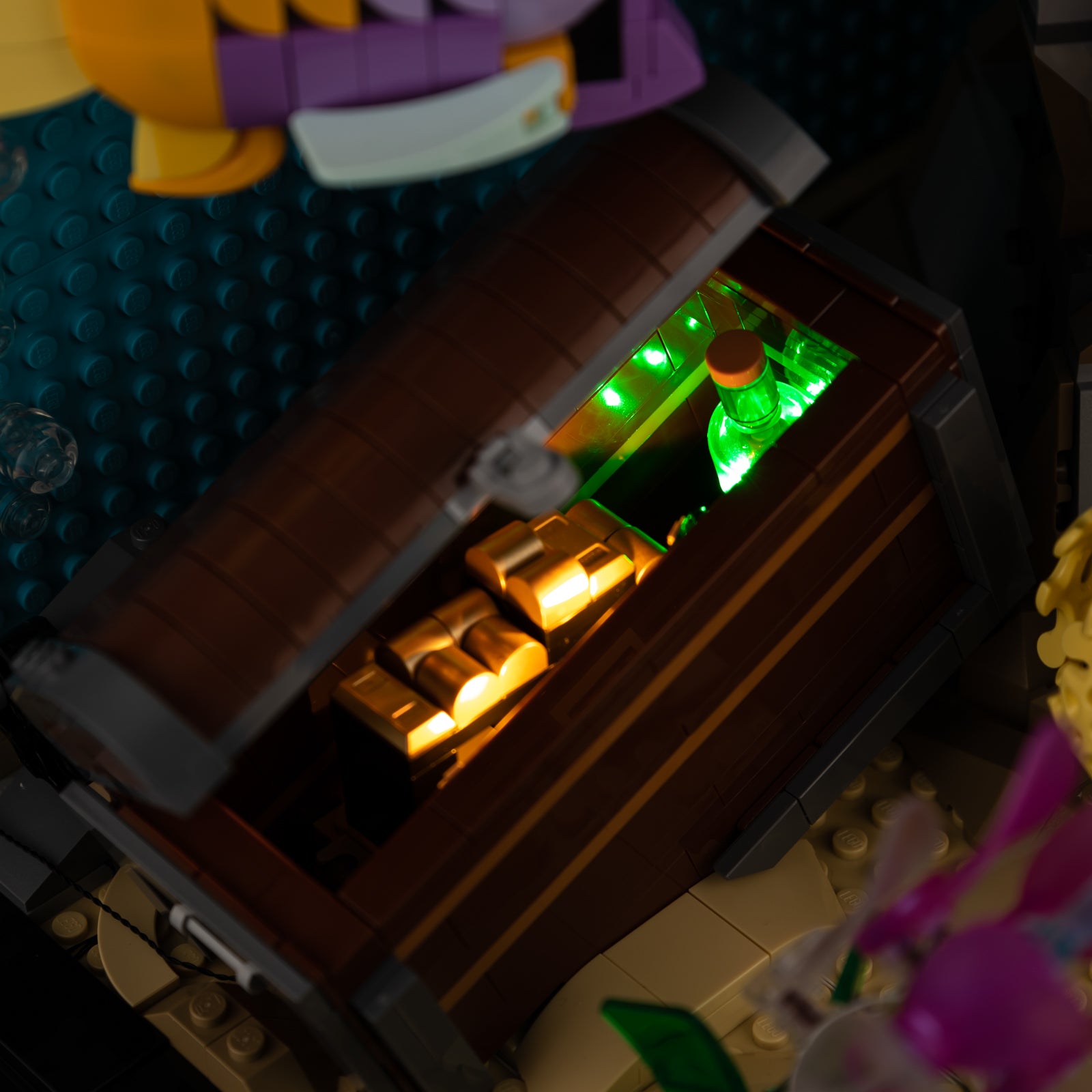 Craft a stunning marine habitat filled with coral, sea plants, fish, and treasure — then bring it to life with integrated LEGO LED Lights. Highlight the fish swimming by, the glowing pearl in its shell, and the treasure chest as it bursts open under a spotlight. It’s not just a tank — it’s an aquarium spectacle.
