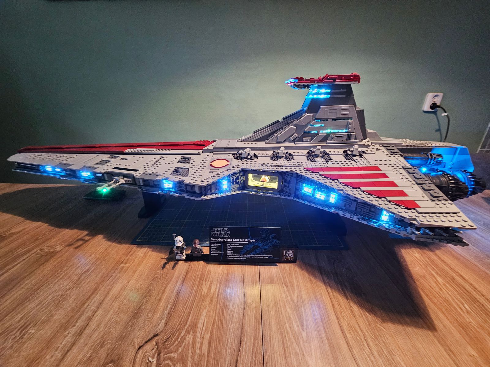 Measuring a staggering 43 in. (109 cm) in length, this majestic model stands as a testament to the grandeur of the Star Wars universe. Every intricate detail, from the command bridge to the hangar housing a buildable scale model of a Republic Gunship, now shines even more brilliantly under the spotlight of LEGO lights. The built-in display stand, complete with an information plaque, Clone Wars 20th-anniversary brick, and space for the iconic minifigures of Captain Rex and Admiral Yularen, is accentuated by the soft glow of LEGO LED lights, making it a centerpiece worthy of any collector's showcase.